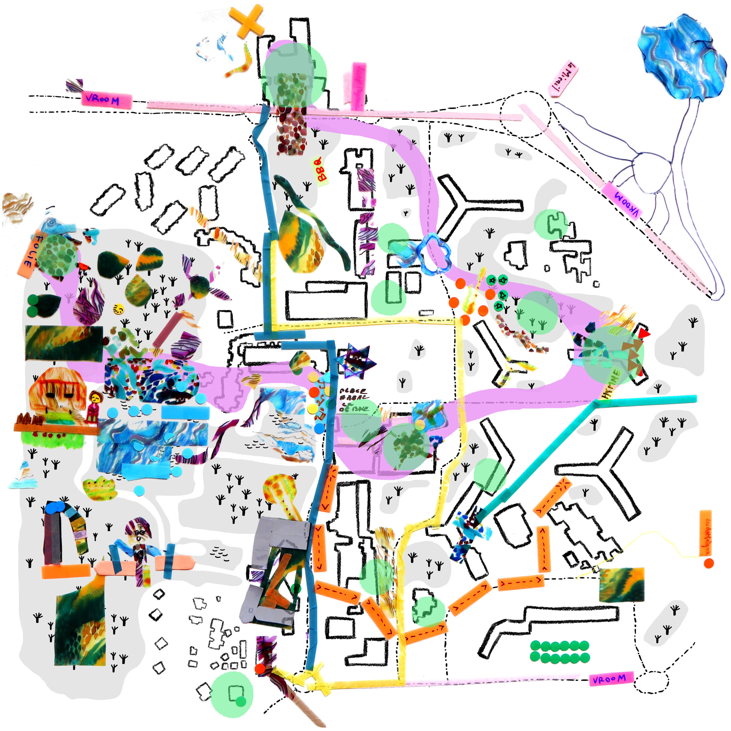 Carte représentant le parcours de randonnée autour du campus universitaire du Mirail, défini par les musiciens du collectif Freddy Morezon et le CIAM de l’Université Jean Jaurès. Réalisée lors d’ateliers de cartographie sensible réunissant étudiants, personnel de l’université et artistes du collectif, elle a été présentée au public les 10 et 17 octobre 2023.